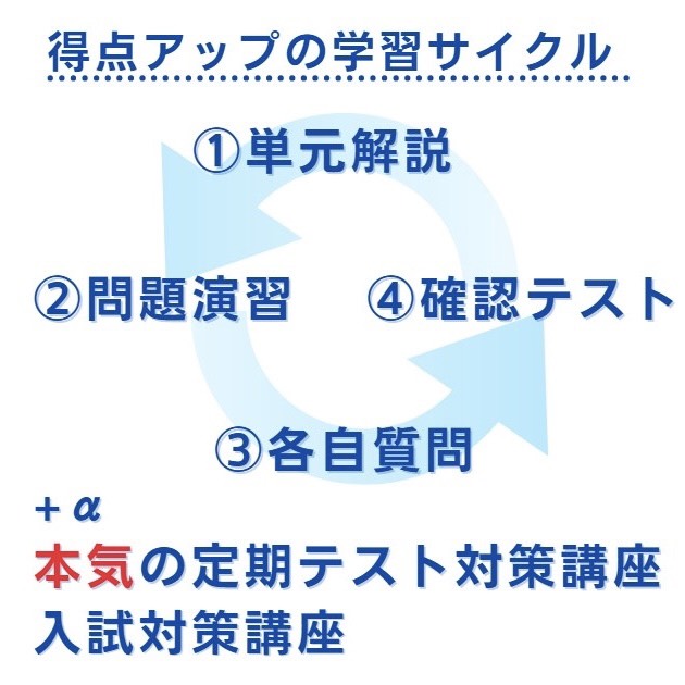 左の学習サイクルで授業を行い、得点アップはもちろんのこと、進学後の学習も自力でできるようサポートいたします。