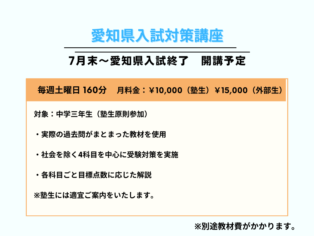 夏休み頃を目安に、愛知県入試過去問がまとまった教材を使用して社会を除く4科目を中心に受験対策を行います。(社会科に関しては学習方法、過去問演習などのサポートのみになります。解説等の時間はこの講座で設けておりません。)